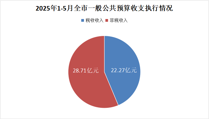 2025年1-5月,全市一般公共预算收入完成50.98亿元,同比下降0.67%。其中:税收收入完成22.27亿元,同比增长4.65%,税收占比43.69%;非税收入完成28.71亿元,同比下降4.44%。一般公共预算支出完成123.35亿元,同比增长4.92%。